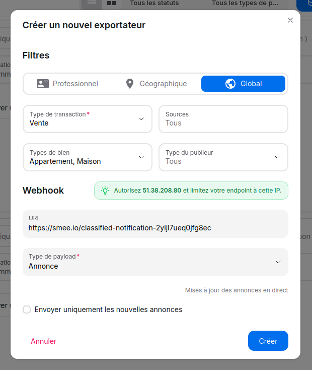 - classifieds-export: https://smee.io/classifieds-export-holes6hi6y85rx31Ce que cela fait pour vous :
